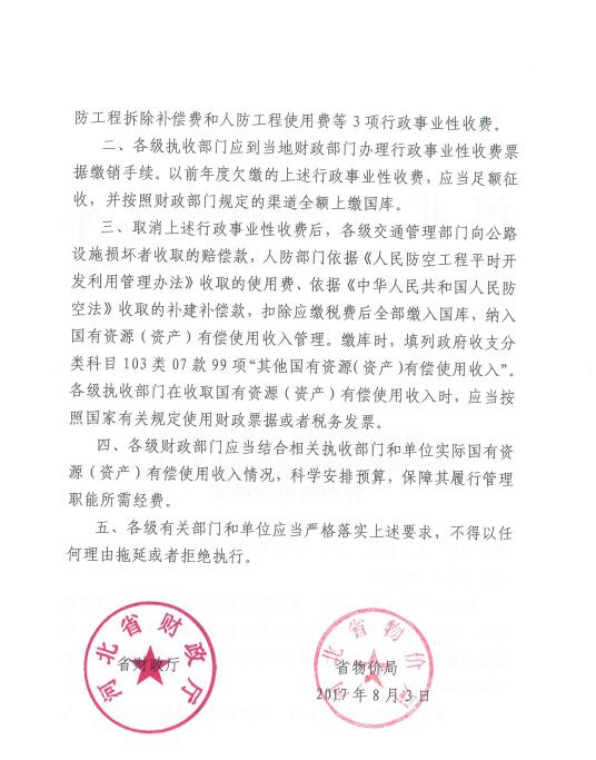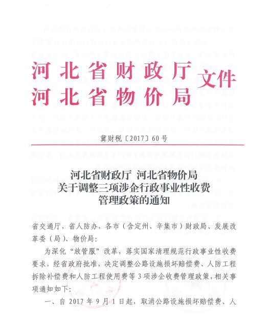 现将河北省财政厅、河北省物价局《关于调整三项涉企行政事业性收费管理政策的通知》(冀财税〔2017〕60号)转发给你们,请遵照执行。